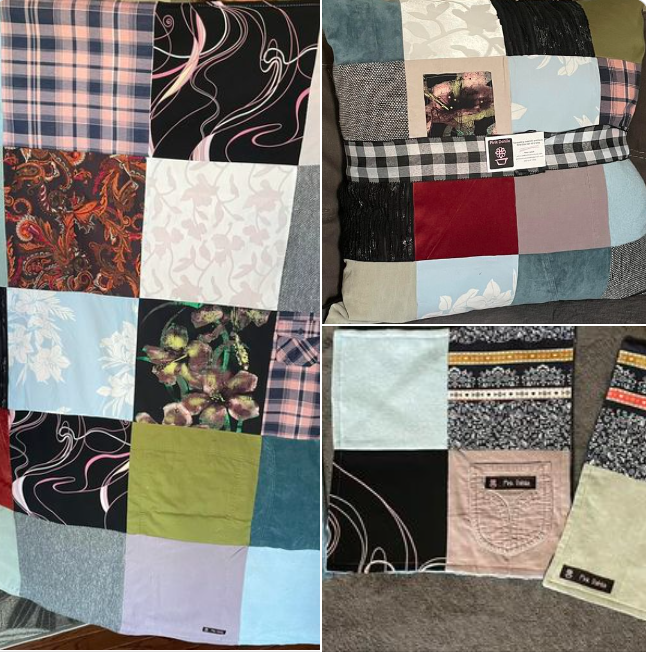 “When my Grandma passed away I made sure I took some clothes with hopes I could repurpose them for something…and thanks to a friend who told me about Pink Dahlia I found the perfect way to use her stuff! Kate was able to make me a blanket, a pillow to surprise my Grandpa with, and even took it upon herself to make three small blankets for my kids!!! This woman is one of the best human beings I’ve ever met. When I first brought everything to her she sat with me and my daughter and wanted to know all about my Grandma…she took note and even made sure to incorporate any clothing with flowers because I mentioned her love of gardening…She was so kind, and put so much love into making our items for us. If you’re looking for something like this or a special way to honor a loved one PLEASE go see Kate!!! I can’t recommend her enough!!!”